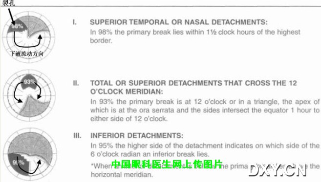 从视盘下方裂孔来的视网膜下液开始沿着裂孔扩展,然后下降到锯齿缘。脱离向着视盘方向进展,在裂孔一侧,脱离的边界比裂孔位置要高。因此,网脱更高的一边就是视网膜裂孔所在的位置。如果液面不等,裂孔应该就在6点钟位的1或2mm处。如果两边网膜脱离相等,裂孔应该在六点钟位。下方的裂孔进展缓慢,所以可能发现的很晚。95%的裂孔位于脱离较高的一侧网膜上。偶尔,下方脱离,而且两边脱离高度相等,是上方裂孔通过周边浅脱离而致。如果病情进展迅速,而且色素分界线的出现,是上方裂孔的标志。下方裂孔导致的下方脱离,一般相对较浅。当下方脱离呈大泡状,原发孔位于上方。