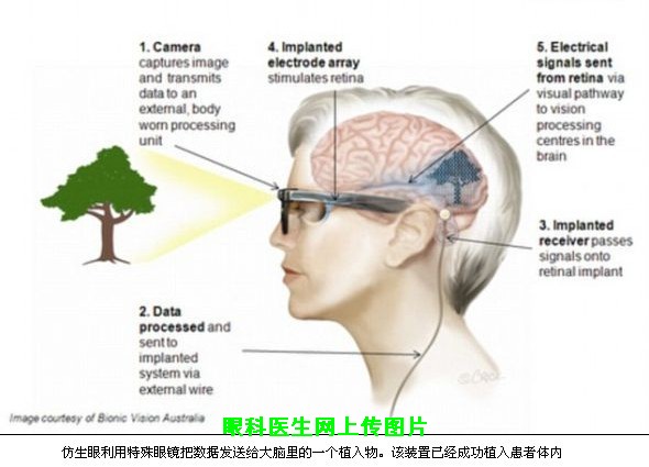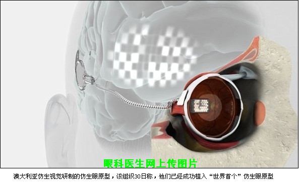 由澳大利亚政府提供部分资金的科研机构澳大利亚仿生视觉(Bionic Vision Australia)设计、制造并试验了这款仿生眼。它拥有24个电极,通过一根从眼睛后面延伸出来的小线,与耳朵后面附着的感受器连接在一起。它被植入眼睛视网膜附近的脉络膜空间里。参与植入这个仿生眼的外科专家彭妮-艾伦博士说:“该装置用电刺激视网膜。电脉冲经过这个装置,刺激视网膜。然后这些脉冲传回大脑,生成图像。”该装置能让患者恢复轻度视力,区分光和黑色物体的明暗对比及边缘。研究人员希望进一步完善这个装置,以便失明患者能够实现独立生活。