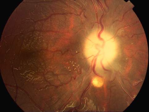 患者双眼底相。双视乳头色白,轻度隆起,边界欠清,视网膜静脉迂曲扩张,视网膜下渗出,后极部视网膜轻度水肿。