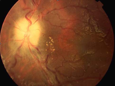 患者,陈XX,男,4.5岁。因家长发现患者看不见一个月,于2002年7月到我院就诊。患者为足月顺产,生长于四川农村,平素体健。近两年来,因父母在外打工,患者在家和祖母一起生活。就诊前两个月,患者母亲得知孩子“生病”,回家后觉孩子“象感冒”,精神不如以前,但仍能够画画,未予特殊治疗。一个月后母亲发现孩子视力差,不肯自己玩耍,经常腹痛,遂在重庆、成都及北京等地诊治,疑“双眼视神经炎”,曾服“激素”,中药,具体不详,无明显好转。我院就诊情况:双眼无光感,双瞳孔等圆,直径约2mm,直接及间接对光反射消失。双眼各方向活动不受限,双眼结膜无充血,前房清亮,双眼。晶状体无混浊。双眼视乳头色白,轻度隆起,边界欠清,视网膜静脉迂曲扩张,双眼视盘颞侧视网膜下黄色斑点样渗出,右眼视盘下方视网膜下黄白色圆形渗出。后极部视网膜轻度水肿,黄斑中心反光消失(双眼底见图)。辅助检查:视觉诱发电位(闪光VEP):波形未能引出。头颅CT:颅内未见占位性病变。周围血白细胞:7.4X109 , 肝功能:ALT 88u/l(正常值:5-40),AST 58u/l(正常值:5-37),ALP 117u/l(正常值:27-107),肾功能:BUN 13 mg/dl (正常值:3.0-20.0),肌酐0.63 mg/dl (正常值:1.5-0.6),血磷 6.2 mg/dl (正常值:2.3-4.3),血钙 10.2 mg/dl (正常值:8.5-10.8) 。