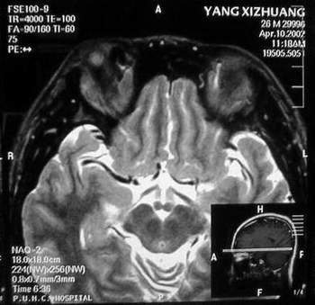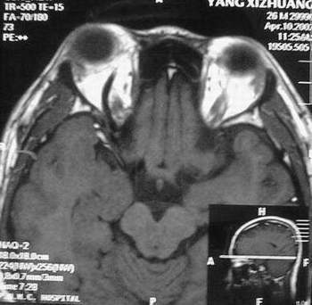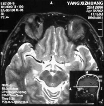 杨某,男,27岁。主因右眼进行性眼球突出一年。我院门诊就诊。发病来,患者无明显视物模糊,无视物成双。自觉无明显眼痛。五年前曾有食物中毒史。当地医院行CT检查,发现右眼眶鼻上方较高密度占位。