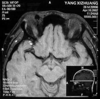 患者压颈及其它Valsava试验结果阴性。从MRI分析,在T1、T2、T+C检查该支血管均为明显流空现象,说明该血管血流速度很快,而从走行和分布看,眼上静脉可能性很大。也许也不能除外异常的眼动脉或异常血管。眶内主要可能的血管病变包括颈内动脉海绵窦瘘(高流窦)、AVM、眼眶静脉曲张、海绵状血管瘤、静脉性血管瘤、毛细血管瘤和眶内动脉瘤。。
