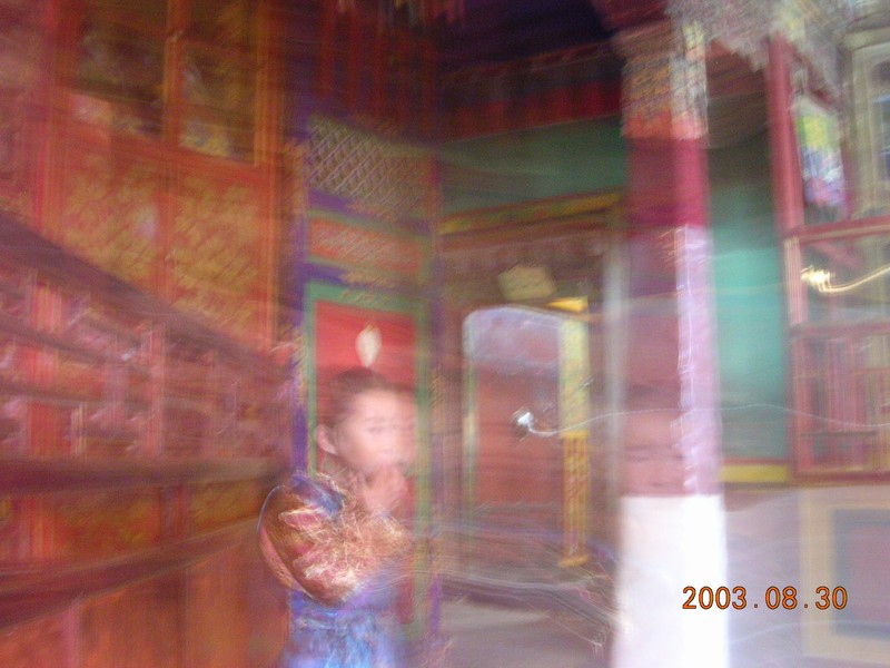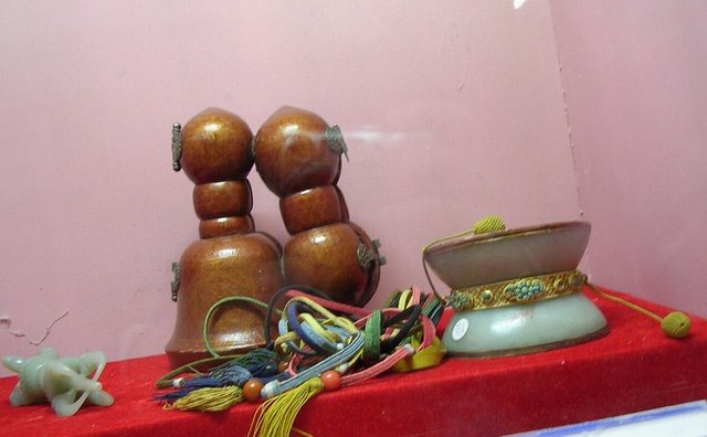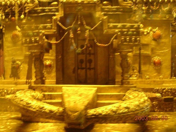 进入布达拉宫就不能随便照相或摄影,里面的光线很暗以保护壁画和装饰品。个别地方可以照相但价格是我们根本无法接受(60-90元每张)。我们决定关了数码相机的闪光来偷拍某些有专门照明的东东。布达拉宫里面的装饰非常豪华,很多佛塔或灵塔都是由黄金加上宝石做成,特别是五世达赖喇嘛的灵塔最为豪华,用了3721公斤的黄金和数万颗宝石做成,他的肉身已经保持在灵塔内数百年,但是从来没有人能够看到他的真身。我们跟随一个旅行团的导游听她的解说,在走马观花中能了解一些历史和传说。布达拉宫中也有松赞干布和他两个妻子(尼泊尔公主和文成公主)的佛殿,听导游解说,松赞干布王的两个外族妻子都没有留下子嗣,触摸殿内一个锅沿可以成为好的厨师或为打牌带来好的手气。可惜我对两者都没有兴趣,所以就懒得排队去触摸了。在参观布达拉宫的珍宝馆时我们的数码相机有了用武之地,偷偷拍了一些珍宝的照片,虽然不一定有什么用处,但这种偷拍带来的刺激反而让我们乐不疲此。布达拉宫的收藏真是非常丰富,佛经、合金的佛器和一些大型的装饰物件,例如黄金打造的天堂和地狱景象都是无价之宝。另一个给我留下深刻印象的是布达拉宫佛像前的世界各国的货币展示(提示大家捐钱?@#%^$&*^)和喇嘛们用笤帚和麻袋装垃圾一样的纸币和每个宫殿中值守的喇嘛都在用手机,甚至还在发短信(避免铃声打扰佛像??@@@……)。布达拉宫的红宫的参观结束前化十快钱来到布达拉宫红宫的顶端可以一览拉萨市容和拍照。白宫的参观更是简单,看了一个僧侣们休息的地方就结束了。整个参观的行程大约3小时,出了布达拉宫,布达拉宫门口的小贩热情的推销各种防止的纪念品,开价80元的项链可以侃价到10元,开价750元的铜佛像可以还价到数十元!!@@@……
