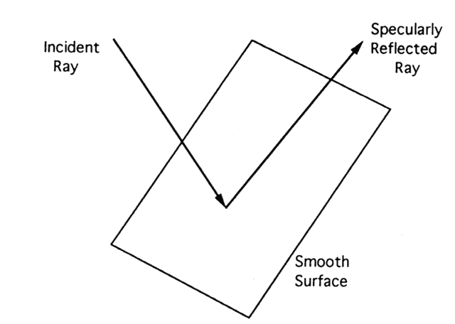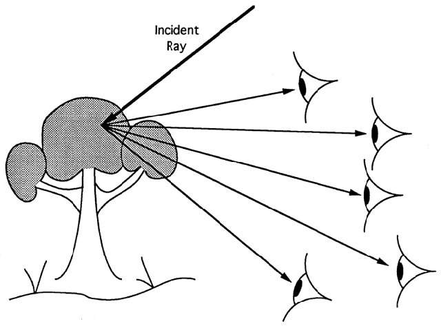 Diffuse reflection should not be confused with specular reflection. In specular reflection, light symmetrically rebounds in a single direction instead of scattering in many directions (Fig. 6). From the standpoint of geometrical optics, the most important characteristic of an object, whether luminous or nonluminous, is that every point of the object radiates light in all directions. Surfaces that reflect specularly are mirrors, not objects.
