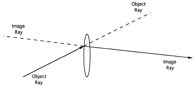 Field curvature and distortion are not always undesirable. Photographers use distortion for aesthetic effects. Panoramic cameras have field curvature but use curved film to compensate. Nevertheless, geometrical optics defines the ideal image as stigmatic and free of field curvature or distortion. The ideal image may be enlarged, reduced, or inverted with respect to the object. RAYS A ray is an abstract representation of a light path. An arrow indicates the propagation direction. Rays represent paths, not the light moving along those paths. A ray gives no indication of the physical characteristics (e.g., intensity, wavelength, and so forth) of the light traveling along the ray. It may seem somewhat pedantic, but lenses bend light, not rays. When a ray strikes the surface of a lens or mirror, it does not deviate. The light moving along the ray changes direction and begins to move along a new ray. Rays continue straight through the surface of a mirror or a lens, but the light does not (Fig. 15). Rays extend infinitely in both directions. Light travels over only a segment of the ray. The distinction between a ray and the light moving along a ray becomes important later when dealing with pupils and virtual images. For clarity, illustrations usually show only the portion of a ray over which light travels, but rays are straight and infinite in extent. It must be noted that it is common practice and more economical to use statements such as “the lens bends the ray” instead of “the lens bends light traveling along the ray.” Of course, the implication is that the light bends, not the ray. Any ray that intersects the object point is an object ray. Similarly, image rays intersect the image point. Object rays represent light before it has entered the optical system, and image rays represent light after it emerges from the system. Every object ray entering an optical system gives rise to a unique image ray. Thus, every object ray is associated with a unique image ray, and vice versa. |