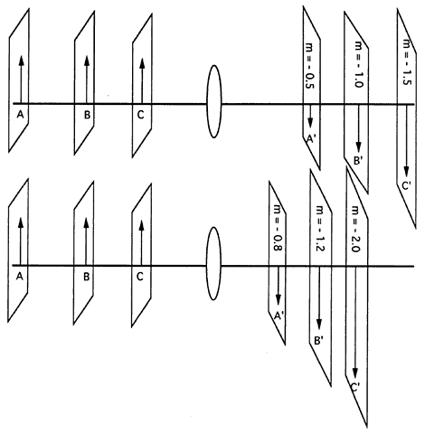 lenses are illustrated as “black boxes” (Fig. 16). Objects are usually three-dimensional, but it is easier to describe optical properties using flat objects confined to planes. An object plane is normal to the axis and contains an object (see Fig. 16). Every point in an object plane is a potential object point or point source. Image planes are normal to the axis, and every point in the image plane is a potential image point. Conjugate refers, in a rather general way, to the object-image relationship. Let O and O' be, respectively, an object point and its image. O is conjugate to O'. Similarly, O' is conjugate to O. Collectively, O and O' constitute a pair of conjugate points. Transverse magnification is the ratio of image height to object height. Two aspects of magnification are confusing. In common parlance, magnification implies enlargement, but in optics, magnification applies to any image whether larger or smaller than the object. Images are scale models of the object, and magnification is the scale factor. Magnification also indicates the image's orientation with respect to the object. A negative magnification indicates an inverted image. For example, a magnification of -2 means the image is inverted and twice the size of the object. A magnification of 0.5 indicates that the image is upright and half the size of the original. Transverse magnification applies to linear dimension. Thus, a 1-inch-wide, 2-inch-high object magnified by a factor of two gives a 2-inch-wide, 4-inch-high image. Both the height and width change by a factor of two, increasing the image's area by a factor of four. |