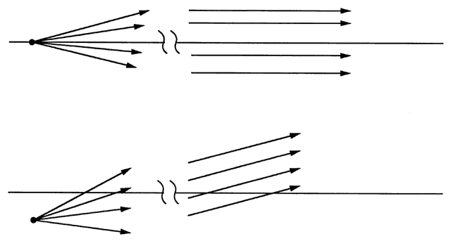 The one-to-one correspondence between object and image points is the essential feature of the stigmatic image. The word stigmatic derives from the Greek “stigma,” meaning stylus or point, and emphasizes the point-to-point nature of the stigmatic image. Imaging is a two-step process. In the first step, an object distributes light in all directions. This is an important step. If an object radiates light in only one direction, then it will be visible from only one vantage point (Fig. 10). Scattering light makes objects visible from many directions simultaneously (Fig. 11). Although beneficial, scattering necessitates a second step, the redirection of light by an optical system to produce an image.