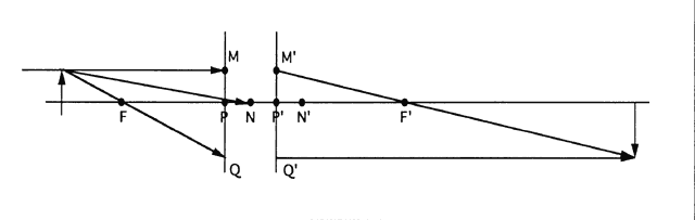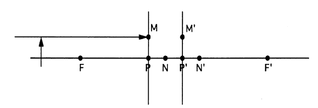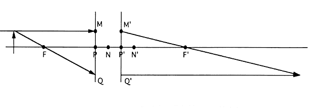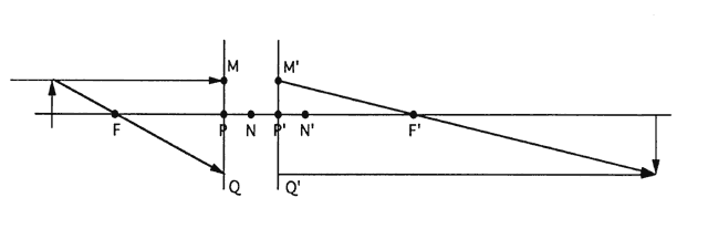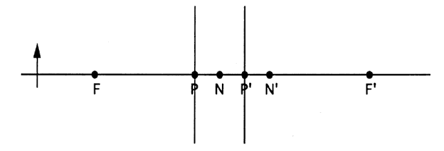 STEP 1. Ignore the presence of the lenses because the locations of the cardinal points completely determine the properties of an ideal system. If necessary, redraw the object and optical system to scale using just the optical axis and cardinal points. Draw the principal planes through the principal points and normal to the axis (Fig. 26).