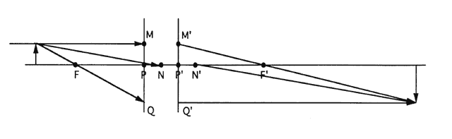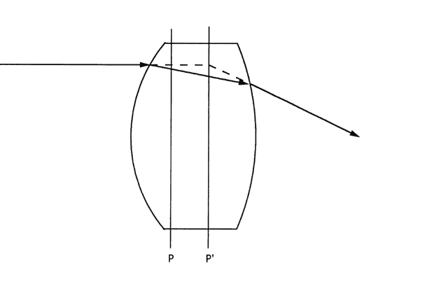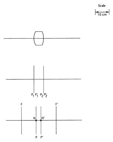 RAY SKETCH Although physically the lens has two surfaces, optically the lens is thin so it can be represented by a single surface. As in the case of a single refracting surface, the principal planes coincide. The difference between this and the previous examples is that the nodal points coincide with the principal points. The ray sketch is shown in Figures 93 and 94.