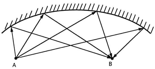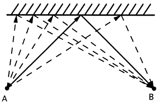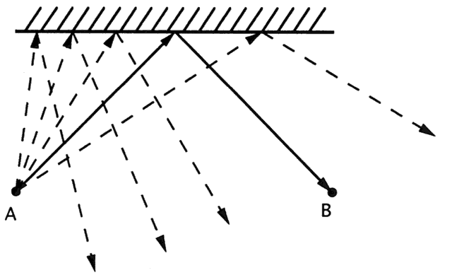 from point A to point B along the path requiring the least time. For instance, suppose light moves from A to B by reflection from a flat mirror. Figure 39 shows various potential pathways that light could follow. One path is shorter than any other; therefore, light moving along this path reaches B in the least time. Light moves from A to B only along this path. Of course, A is a point source and gives off light in all directions. Other rays from A reflect in different directions and do not reach B (Fig. 40).