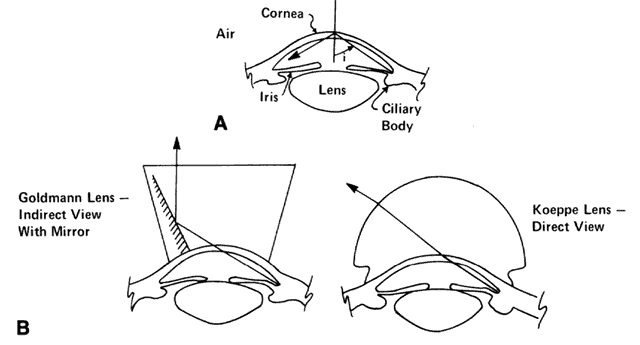 Next, consider light traveling from an object point A in air (n1 = 1) to some point B in glass (n2 = 1.5). Figure 42 shows three potential paths for light moving from A to B, one being a straight line. The straight line is the shortest, but not the fastest, path. Compared with the other paths, the straight line travels the shortest distance in air and the longest distance in glass. Because light moves relatively slowly in glass, light reaches B faster by other paths. Path 3 is the shortest in glass but the longest in air. The time saved by traveling a short distance in glass is more than offset by the extra distance in air, so path 3 is not the fastest. Path 2 is the fastest, representing the best compromise between air and glass. The law of reflection, or Snell's law, is also mathematically derivable from Fermat's principle. Snell's law is easier to express as a formula than it is to express in words. d=n1sin (angle of incidence) n2sin (angle of refraction) As in the law of reflection, the incident ray, refracted ray, and surface normal lie in the same plane. Notice that when light moves from a lower refractive index to a higher index, it bends toward the surface normal. Conversely, light bends away from the surface normal when moving from a higher index to a lower index. Just as in reflection, it is possible to bend the refracting surface to achieve a stigmatic image of A at point B. Again, all of the light from A must reach B simultaneously. The laws of reflection and refraction are consequences of Fermat's principle, but there is an important distinction between the laws and the principle. When given a ray incident on a refracting surface, use Snell's law to determine the path of the refracted ray. When given two points separated by a refracting surface, use Fermat's principle to determine the path or paths light follows when moving between the two specified points. Similar reasoning applies to reflection. An interesting phenomenon occurs when light moves from a higher index medium to a lower index medium. If the angle of incidence exceeds the critical angle, light does not pass into the lower index medium. Instead, light is reflected (Fig. 43). This is called total internal reflection (TIR). The critical angle depends on the ratio of the refractive indices of the two media (see Appendix). Optically, TIR is very useful. Many instruments for measuring refractive index use TIR. However, TIR can also cause problems. TIR makes it impossible to view the anterior chamber angle without a gonioscopy lens (Fig. 44). |