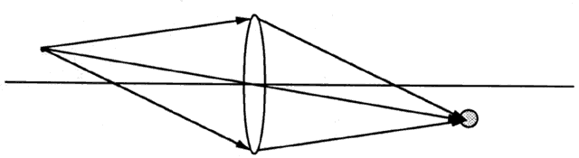 A point source (Fig. 7) occupies no volume (i.e., a point in the mathematical sense) and radiates light in all directions. Point sources do not exist, but conceptually, objects are simply a collection of point sources. Every object point is a point source radiating in all directions. Point sources simplify the analysis of optical systems by making it possible to deal with one object point at a time. THE STIGMATIC IMAGE Each point on a screen (e.g., piece of paper) placed near an object receives light from many object points (Fig. 8), and no image appears. An appropriate lens placed between screen and object redirects light so that each point on the screen receives light from a single object point (Fig. 9), thereby producing an image. Without the lens, light from a single object point distributes over the entire screen, mixing with light from every other object point. With the lens, however, light from a single object point falls on a single screen point and does not mix with light from any other object point.