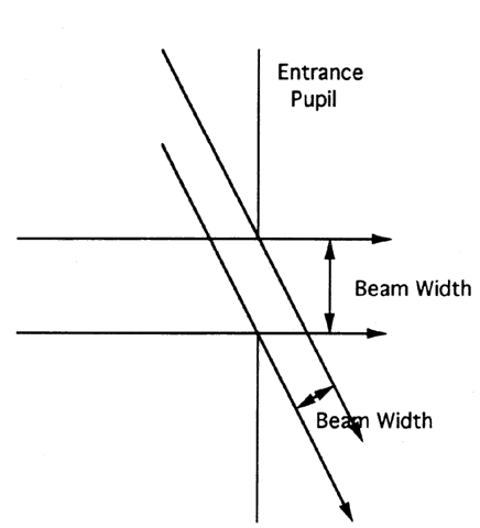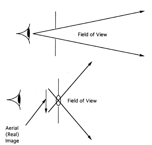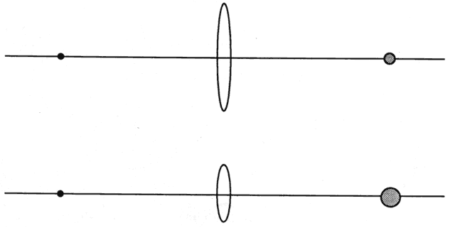 Where d = the diameter of the Airy disk, W = the wavelength of the light (about 0.55 μm), and A = the diameter of the aperture stop. For a given lens, the diameter of the Airy disk increases as the aperture decreases. Consider two lenses identical in power, both producing (geometrically) stigmatic images, but one with a smaller diameter. The smaller-diameter lens gives a poorer image because of greater diffraction (Fig. 57).