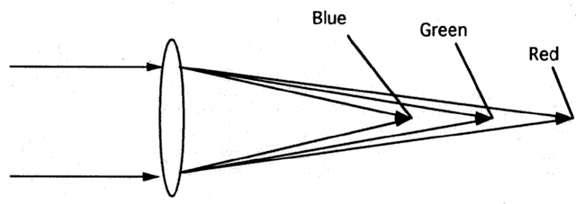 be stigmatic. Ignoring diffraction, any deviation from ideal behavior is an aberration. Field curvature and distortion are two examples of aberrations, but the image is still stigmatic in these aberrations. In other aberrations, the image is nonstigmatic. The spot diagram shows the distribution of rays in the image based on an exact calculation using Snell's law without any approximations, although diffraction effects are ignored. Diffraction spreads light in nonstigmatic images just as in stigmatic images. However, when the aberrations are pronounced, the diffraction effects are insignificant. Figure 58 shows the spot diagrams of three different object points all imaged by the same lens. Note that each object point gives a differently shaped spot. There are several different types of aberrations, some of which are mentioned in the Appendix. Each type of aberration is unique in its behavior and optical characteristics. Generally, decreasing the lens (or pupil) size decreases the aberration. Some aberrations improve dramatically with small decreases in lens diameter; others are barely affected or completely unaffected. Pupil size plays an important role in image quality. If the pupil is small enough, diffraction is the major factor limiting image quality. If the pupil is large, aberrations limit image quality. The best pupil size is a compromise between aberrations and diffraction. The term diffraction-limited is often mistakenly used to imply a high-quality optical system, but this simply means that diffraction limits the optical quality. Any optical system can be made diffraction-limited by sufficiently reducing the aperture. Depending on pupil size, diffraction-limited systems may be inferior to systems limited by aberrations. Chromatic aberration is a particularly important type of aberration. The refractive index of a material is different for every wavelength; as discussed earlier, this is called dispersion. The effect of this variation in index is that red light focuses behind blue light (Fig. 59). The eye exhibits a large amount of chromatic aberration, but image processing by the brain prevents us from being conscious of it. It is easy to demonstrate chromatic aberration by means of the duochrome (or bichrome) technique used in refraction. |