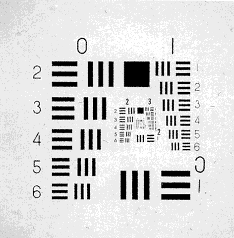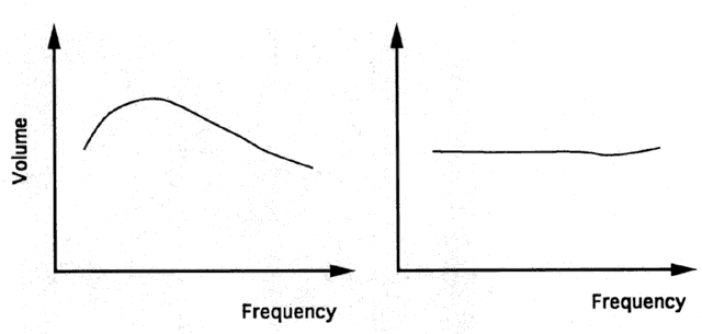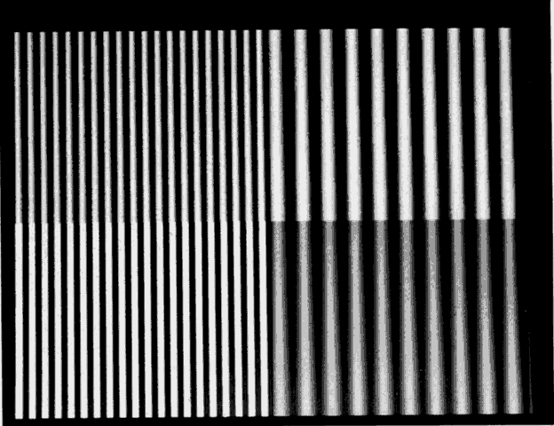 system be gauged objectively and quantitatively? It is fairly simple to assess the quality of a diffraction-limited system. The image of every object point is an identical Airy disk, and the size of the disk determines the amount of detail that is lost. The size of the Airy disk can be calculated from a formula, but it is better to evaluate an optical system by some bench test rather than rely on a calculation. In a resolution test, the United States Air Force resolution target (Fig. 60) is imaged by an optical system. Because of diffraction, the smaller line groups are blurry. The resolution is the smallest group of lines that appear as distinctly separate in the image. The resolution test is quite analogous to a Snellen acuity. The results are expressed in terms of line pairs per millimeter rather than a Snellen fraction. One hundred line pairs per millimeter corresponds to 20/20. As an optical test, resolution has some disadvantages. The test depends on a subjective judgment by an observer. It is not truly quantitative because there are only a limited number of line groups. It is impossible to pinpoint the resolution exactly because the true resolution falls somewhere between the groups on the target. Nevertheless, for a diffraction-limited system, resolution is a very useful test of optical performance. However, in the presence of aberrations, resolution does not provide an adequate assessment of optical performance. Two systems can have identical resolutions and yet produce very different images. The modulation transfer function (MTF) provides a more complete evaluation of optical performance, but it is a more complicated test. Perhaps the best way to explain MTF is by analogy to sound. Just as in imaging, audio recordings do not perfectly duplicate the original sound. A sound consists of many individual frequencies or pure tones simultaneously reaching the ear. Two parameters characterize a pure tone: the frequency or pitch and the loudness or volume. A pure tone can be represented by a sine wave. The horizontal distance between peaks indicates pitch, and the vertical distance from peak to valley indicates volume. A sound is a mixture of several different frequencies, each with its own volume. When a sound is recorded, each component frequency gets recorded, but the process changes the volume of each frequency. The playback is a mixture of the same frequencies that constitute the original sound, but at different volumes. The change in volumes causes the recorded sound to differ from the original. If a single pure tone is recorded, the frequency of the recording matches the frequency of the original, but the volume changes. The ratio of the recorded volume to the original volume is the response of the audio system to that particular frequency. If an audio system has different responses to different frequencies, the recorded sound will not match the original. However, if the audio system has the same response to all frequencies, the recorded sound will duplicate the original. A graph of response versus frequency (called a frequency response curve) can be constructed. Figure 61 shows the frequency response of two different audio systems. The second system produces a better recording because the frequency response is flatter.
