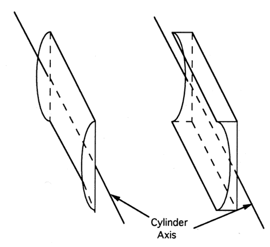 A rotationally symmetric optical system has an axis of symmetry called the optical axis (Figs. 1 and 2). Rotating the system about the axis does not alter the imaging characteristics. Rotationally asymmetric systems do not have an axis. Look through a -1.00 D spherical trial lens. Rotate the lens and notice that the scene does not change. Replace the spherical lens with a prism or cylinder and observe how the scene changes as the lens rotates. Thus, cylinders and prisms are not rotationally symmetric.