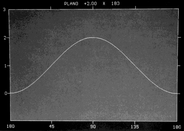 Where PM = power in meridian M, Ps = spherical power, and Pc = cylinder power. To determine the power in a single meridian produced by two torics in contact, simply add the powers of the individual lenses in the same meridian. Adding powers meridian-by-meridian could be a tedious process, but this can be done with a computer. The graphs of power versus meridian nicely illustrate the interaction of spherocylinders at oblique axes. |