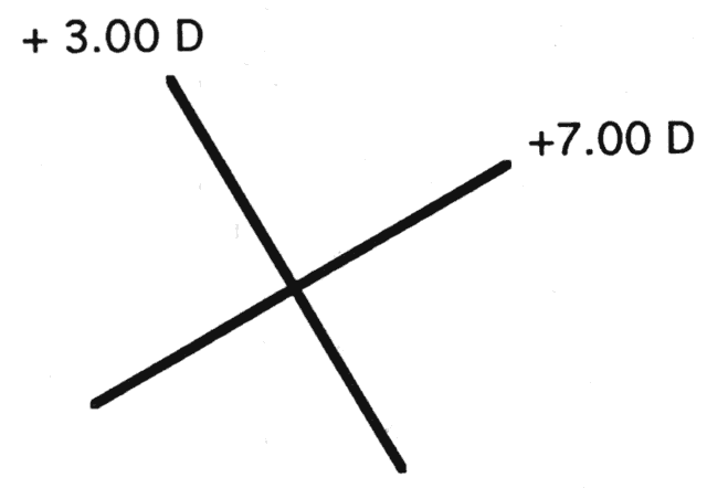 Perhaps the most confusing aspect of spherocylinders is that there are two different ways to designate the same lens; for instance, a + 3.00 D X 030 cylinder combined with a + 7.00 D cylinder X 120 can be considered a + 3.00 D sphere and a + 4.00 D cylinder X 120. Alternatively, this could be a + 7.00 D sphere and a -4.00 D cylinder X 030. These are simply two ways of denoting the same lens. The power cross and the graph of power versus meridian are the same for both designations. It is easy to determine the spherocylinder that results from the combination of two cylinders with axes perpendicular. However, if the axes are not perpendicular, determining the resultant spherocylinder is more complicated. This is discussed in the Appendix. |