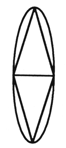 It is also classic teaching to say that a cylinder gives a line image. However, an image is a point-to-point correspondence. A cylindrical lens spreads light from a point source into a line; this is a severe form of aberration called astigmatism. Literally, astigmatism means not stigmatic. However, many aberrations are not stigmatic, so the term is not very descriptive. Place a + 9.00 D cylinder axis horizontal directly behind a + 4.00 D axis vertical cylinder and image a candle. Not surprisingly, the “image” is a horizontal line close to the lenses and a vertical line farther from the lenses. Both lines cannot be seen on the paper simultaneously; it is necessary to move the paper back and forth between the two lines. The location of each line can be calculated by use of vergence. If the candle is 1 m (-1.00 D) from the lenses, the + 9.00 D cylinder gives a horizontal image + 8.00 D (12.5 cm) behind the lenses. The + 4.00 D cylinder gives a vertical line + 3.00 D (33 cm) behind the lenses. Move the screen and explore the region between the two line images. Starting at the vertical line and moving toward the lenses, the image becomes an ellipse with the long axis vertical. As the screen moves forward, the ellipse gets rounder, becoming a circle about midway between the lines. Moving farther forward, the image becomes an ellipse with the long axis horizontal. Moving the screen farther forward, the ellipse elongates until the image becomes a horizontal line. The region between the lines is the conoid of Sturm, and the circle is the circle of least confusion (Fig. 73).
