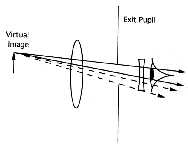 The size of the aperture does not change or in any way regulate the size of the image. Image a candle with a + 4.00 D spherical trial lens. The edge of the lens is the aperture stop. Cover half the lens with a piece of paper (this will make the aperture a semicircle instead of a circle, but this is of no consequence). No part of the image is obscured. The entire flame is present. The paper does not cast a shadow. Instead, the entire image is uniformly dimmer. The aperture size regulates the overall image brightness (actually, the correct term is irradiance, as discussed below). In the experiment above, covering half the lens reduces the light reaching the image by 50%. However, the brightness is barely diminished because the visual system does not respond linearly. Brightness is perception that depends in part on the amount of light incident on the retina, but also on the way the nervous system responds to light on the retina. An interesting experiment is to place two identical trial lenses side by side and equidistant from the candle so that the images are next to each other (but not overlapping). Partially cover one lens with a piece of paper. Using the unobscured image for comparison, adjust the paper until one image appears half as bright. Almost 90% of the lens must be obscured to produce a 50% brightness decrease. The amount of light power per unit area of an image is called the irradiance. Irradiance varies linearly with the aperture's area. Thus, a 50% decrease in aperture area does produce a 50% decrease in irradiance. Bear in mind that irradiance varies with aperture area, not aperture diameter. Clinically, pupil size is specified as a diameter. If the pupil size changes from 2 to 3 mm (a 50% change in diameter), the pupil area increases by 125%, more than doubling the retinal irradiance. Although the retinal irradiance more than doubles, the change in brightness is only modest. Consider the point source, lens, and aperture shown in Figure 67. Some of the rays passing through the lens are blocked by the aperture. It would be convenient to be able to determine which rays traverse the aperture without having to use Snell's law to calculate the exact path of each ray. The entrance pupil enables one to determine exactly which object rays reach the image without the need for any calculation or ray tracing. The entrance pupil is the image of the aperture stop formed by all optical elements anterior to the stop. Once the position and size of the entrance pupil are known, it is easy to determine which object rays reach the image. Ignore every optical element between the object and entrance pupil. If an object ray (which does not deviate) passes through the entrance pupil, it will reach the image. If an object ray is blocked by the entrance pupil, it will not reach the image. Once again, optical terminology can lead to confusion. Clearly, the iris is the eye's aperture stop. Anatomically, the hole in the iris is the pupil, but optically it is not a pupil but rather a stop. Clinically, one does not measure the actual size of the anatomic pupil. The pupil is viewed through the cornea. That is to say, the clinician measures the size of the image of the pupil formed by the cornea, not the pupil per se. Thus, clinically, pupil size refers to the size of the entrance pupil, which is about 20% larger than the anatomic pupil. The aperture stop limits rays from an on-axis object point. The stop may or may not be the limiting aperture for off-axis points. Figure 68 shows that for some off-axis points the aperture stop is still the limiting aperture. However, for far off-axis points, some rays traversing the stop are clipped by other lens elements. This is vignetting. In old cameras, vignetting was prominent and caused photographs to be dim at the edges. In direct ophthalmoscopy, vignetting limits the field-of-view. The exit pupil is the image of the stop formed by all optical elements posterior to the stop. The major importance of the exit pupil is when using an optical instrument in front of the eye. For example, the best way to use a microscope is to place the eye's entrance pupil at the exit pupil of the scope. The same holds for other visual instruments. The chief ray is the ray from an on-axis or off-axis object point that goes through the center of the entrance pupil. Necessarily, this ray also goes through the center of the stop and through the exit pupil because all three points are conjugate to each other. A marginal ray is a ray from any object point that just clears the entrance pupil. The marginal ray will also just scrape by the edge of the stop and exit pupil because these points are conjugate. Apertures also control the aberrations of an optical system. For example, the early box cameras used a single lens (Fig. 69). If the aperture is at the lens, there is considerable field curvature, and the photograph will be blurry at the edges. By moving the aperture slightly in front of the lens, the field curvature is markedly reduced. The photograph is greatly improved simply by moving the stop a few millimeters. A detailed discussion of the affects of stop location on aberrations is beyond the scope of this chapter. Basically, the stop controls the part of the lens used for image formation. With the stop at the lens, all object rays traverse the center of the lens. With the stop in front of the lens, on-axis object rays pass through the lens center, but off-axis rays pass through the lens periphery. The field curvature is controlled by using different parts of the lens to image different object points. |