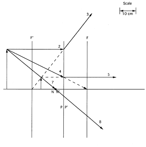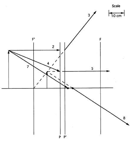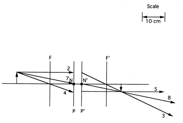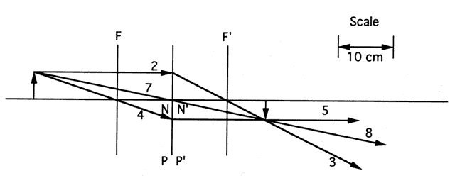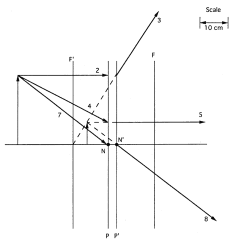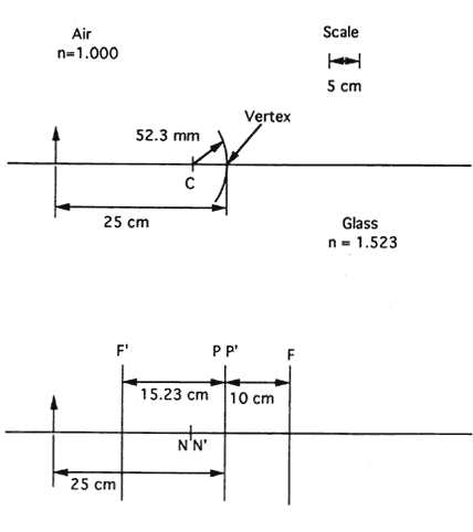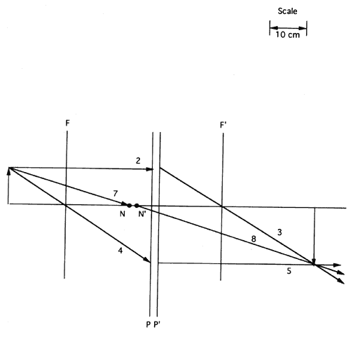 The primary focal point is nair/+ 10.00 D = 10.00 cm in front of the vertex. The secondary focal point is nglass/+ 10.00 D = 15.23 cm behind the vertex. The cardinal points are shown in Figure 88. Steps 2 through 8: These are illustrated in Figure 89.