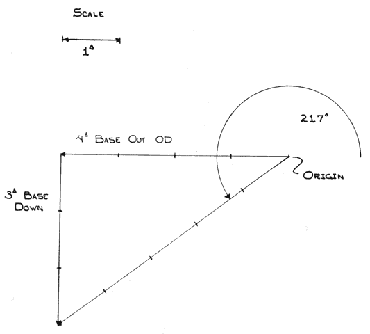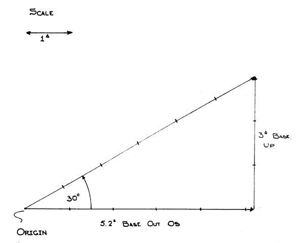 As a second example, suppose a patient has 6Δ of prism OS base at 30°. What is the combined deviation? First, draw the vector on the graph paper. From the end of the vector, extend a vertical line to the horizontal axis and a horizontal line to the vertical axis. The length of these horizontal and vertical lines gives individual prisms (Fig. 105).