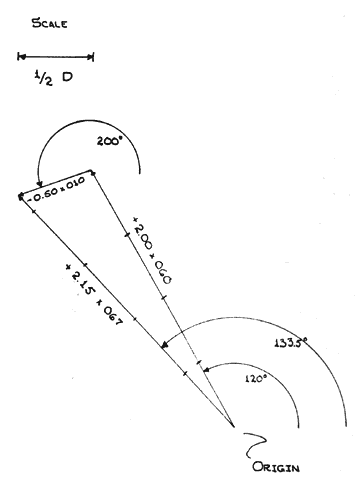 In general, postoperative K-readings differ from preoperative K-readings. The change in corneal power is often called the surgically induced astigmatism. However, the term surgically induced astigmatism is somewhat misleading because, in general, there is both a spherical and an astigmatic change in corneal power. Consequently, the term surgically induced change in corneal power (SICCP) will be used. Conceptually, the SICCP is simply the difference between the postoperative and preoperative corneal powers. The difficulty comes in actually calculating the SICCP because this usually involves subtracting spherocylinders at oblique axes. There are several ways to calculate SICCP, and again these will be illustrated by using a specific example. Consider a patient with preoperative K-readings of 45.00/45.50 at 100; after radial keratotomy the K-readings are 40.00/42.00 at 150. What is the SICCP? No matter what method is used to calculate the SICCP, a useful first step would be to transpose the K's to standard spherocylinder form (either plus or minus cylinder depending on personal preference). Thus, Postoperatively: + 40.00 + 2.00 × 060, or + 42.00 -2.00 × 150 Preoperatively: + 45.00 + 0.50 × 010, or + 45.50 -0.50 × 100. LENSMETER METHODAn approximate determination of SICCP can be made by use of the lensmeter and trial lenses. First, consider only the cylinder power. If plus cylinders are used, the postoperative cylinder is + 2.00 × 060, and preoperatively it is + 0.50 × 010. To subtract the preoperative cylinder from the postoperative cylinder, select a + 2.00 cylindrical trial lens and place it in a trial frame at axis 150. Then select a -0.50 cylindrical trial lens and place it at axis 010 in the trial frame. Note that a -0.50 lens is used because one wants to subtract the preoperative power from the postoperative power. Be sure to maintain the axis of the -0.50 cylinder at 010 (i.e., change the power but not the axis when subtracting cylinder). Measure the combination in the lensmeter. The author found a power of -0.37 + 2.25 × 072. Note that the combination of two pure cylinders at oblique axes produces some spherical power. Next, subtract the preoperative sphere from the postoperative sphere, obtaining -5.00. Finally, add the sphere to the spherocylinder to give -5.37 + 2.25 × 072 for the SICCP. Using minus cylinders, one would use -2.00 × 150 and + 0.50 × 100 trial lenses and measure the combination in the lensmeter (+ 0.37 - 2.25 × 162). Subtracting the preoperative sphere from the postoperative gives -3.50. Adding the sphere and cylinder gives -3.12 - 2.25 × 162. The advantage of the lensmeter method is that it avoids calculation. The disadvantage is that the answer is only approximate, although often it is sufficiently accurate for clinical purposes. For that matter, the K-readings themselves are not perfectly accurate either. VECTOR GRAPHICAL METHODAn alternative to the lensmeter that also has the advantage of avoiding calculation but is more accurate is the graphical vector method. In this method, the vector subtraction is performed with ruler, protractor, and graph paper. When vectors are used to represent a cylinder, the vector angle is the axis multiplied by 2, because vector angles vary over a range of 360°, whereas cylinder axes vary over a range of only 180°. The first step is to select a convenient scale. In this case, 1 diopter equals 2 inches is suitable (for greater accuracy it is best to use a large scale). The vector representing a + 2.00 × 060 cylinder would be 4 inches long and make an angle of 120° with the horizontal (Fig. 106). The vector representing -0.50 × 010 is drawn at the end of the first vector at an angle of 200° with the horizontal (to graph vectors representing negative powers, add 180° to the angle--e.g., 10 × 2 + 180 = 200°). The resultant is found by drawing a vector from the origin to the end of the second vector (+ 2.15 × 067).