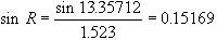 VERGENCE CALCULATION The object's reduced vergence is -4.00 D (= -1.00/ 0.25 m). The image's reduced vergence is + 6.00 D. The image is real because the image vergence is positive. The image distance is 1.523/6.00 = 25.38 cm. The transverse magnification is -4.00/6.00 = -2/3. The image is inverted and reduced. EXACT RAY TRACEConsider the ray shown in Figure 90. With use of trigonometric analysis, which is beyond the scope of this text, this ray is found to intersect the surface at exactly 0.9725 mm behind the vertex and 1.00389 cm above the axis. The angle of incidence is found to be 13.35712°. From this, Snell's law gives: 1.000(sin 13.35712)=1.523 sin R