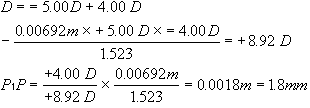 The induced sphere is found by making use of an important principle. Whenever two spherocylinders in contact add (or subtract), the spherical equivalent of the result is the sum (or difference) of the individual spherical equivalents. Thus, SICCP has a spherical equivalent equal to the postoperative spherical equivalent (41.00 D) minus the preoperative spherical equivalent (45.25 D), or -4.25 D. The sphere is whatever is necessary to produce the correct spherical equivalent--in this case, -5.33 D. The SICCP is -5.33 + 2.15 × 067. This method also gives only an approximate result. However, when it is performed with some care, the answer is quite close to the exact result. EXACT CALCULATIONOf course, it is nice to be able to ascertain the exact SICCP. With the ready availability of scientific calculators, it is an easy matter to calculate the SICCP using the following formulas: