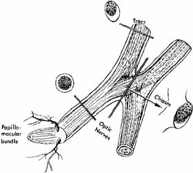 Fig. 9 Representation of the macular (central field) projection in the anterior visual pathways. Most afferent visual fibers are related to the papillomacular bundle, which subserves the central visual field and constitutes the central core of the optic nerve. Note that the crossing macular projection occupies and extensive area of the median bar of the chiasm.