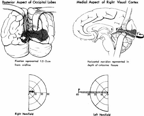 | Fig. 10 Location of visual cortex primarily in interhemispherical fissure. Lateral extension as illustrated is variable. Point F' corresponds to central fixation point F in contralateral field. Peripheral field point P is represented in rostral portion of cortex, P'. S, splenium of corpus callosum. |