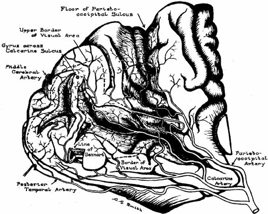 Fig. 15 Blood supply of striate cortex. Medial surface of left occipital lobe with visual cortex outlined by broken line. Calcarine and parieto-occipital fissures are opened to show course of cortical branches of posterior cerebral artery. Note potential triple supply to macular area, via the calcarine, posterior temporal, and middle cerebral arteries. (Smith CG, Richardson WFG: The course and distribution of the arteries supplying the visual (striate) cortex. Am J Ophthalmol 61:1391, 1966)