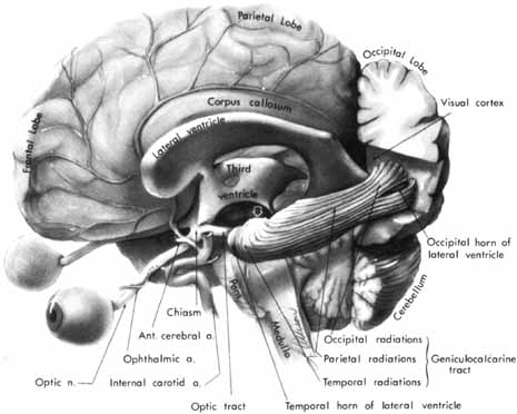 Fig. 1 The visual-sensory system. The left cerebral hemisphere has been removed, with the exception of the occipital lobe and the ventricular system. The left lateral geniculate body is hidden (arrow). Note the following relationships: optic nerve with internal carotid and anterior communicating arteries, chiasm in the floor of third ventricle, forward sweep of temporal radiations around lateral ventricle, course of occipital radiations toward interhemispheral surface of occipital lobe. The cerebral falx and cerebellar tentorium are not illustrated.