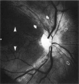 Fig. 2 Retinal nerve fiber layer pattern. The dense temporal arcuate fiber bundles (solid arrows) are most easily seen. Nasal fibers (open arrows) take a more direct radial course. The papillomacular bundle (arrowheads) is most difficult to visualize.