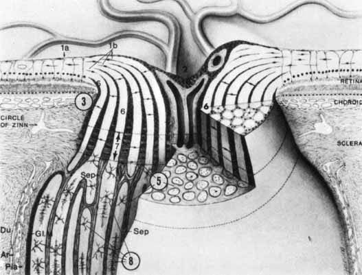 Fig. 3 Schematic structure of optic disc and nerve. 1a, internal limiting membrane of retina; 1b, nerve fiber layer; 2, optic cup, lined by astroglial cells, and central retinal vesels; 3, ophthalmoscopically visible disc edge; 5, glial and connective tissue columns; 6, nerve fiber fascicles; 7, major portion of lamina cribrosa; 8, oligodendrocytes; Du, dura; Ar, arachnoid. Pia, pia; Gl. M, glial mantle; Sep, pial septum. (Modified from Anderson DR, Hoyt WF: Ultrastructure of intraorbital portion of human and monkey optic nerve. Arch Ophthalmol 82:506, 1969)