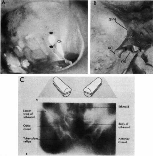 Fig. 5 The optic canal. A. Anterior view of left orbital apex. Orbital end of optic canal is vertically oval (black arrows) and separated from superior orbital fissure (open arrow) by optic strut. Note transilluminated ethmoidal and sphenoidal air cells, which form medial orbital wall and medial wall of optic canal. B. Posterior view of intracranial aspect of left optic canal demonstrating horizontally oval contour. The optic strut (OS) forms the ventrolateral margin of the canal and separates it from the carotid artery. In this preparation the ethmoidal and sphenoidal air cells have been opened. AC, anterior clinoid; PL, planum; SPH, sphenoidal wing. C. Tomographic section of optic canals in upper diagram. Normal axial tomogram below. (Illustration C from Harwood-Nash DC: Optic gliomas and pediatric neuroradiology. Radiol Clin North Am 10:83, 1972)