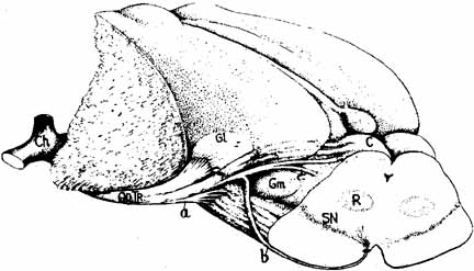 Fig. 7 Terminal relations of optic tract in mammalian brain. Ch, chiasm; Op Tr, optic tract; Gl, lateral geniculate body; Gm, medial geniculate body; C, superior colliculus; R, red nucleus; SN, substantia nigra; a, anterior accessory optic tract; b, posterior accessory optic tract; c, fibers to large-cell nucleus of optic tract. (LeGros Clark WE: The structure and connections of the thalamus. Brain 55:442, 1932)