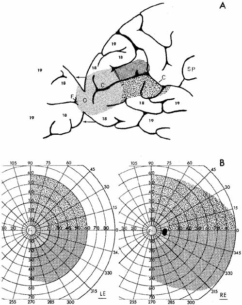 Fig. 11 Occipital lobe and the corresponding projection of the visual field. A. Mesial aspect of left occipital lobe. The posterior pole (O) is flattened to illustrate the lateral surface (arrows), which is composed primarily of areas 18 and 19. The extension of striate cortex onto the lateral surface of the occipital pole is variable. The calcarine fissure (C) separates the striate or calcarine cortex into an upper and a larger lower strip, which also extends further forward toward the splenium (SP) of the corpus callosum. The visual cortex is about 5 cm in horizontal diameter, and the macular projection (fine stipple) may occupy as much as the posterior 2.5 cm. The border zone between macular and peripheral retinal cortical projections is arbitrarily illustrated. B. The right hemifields. Note that the upper field is represented in the inferior calcarine strip and the lower field in the superior calcarine strip. The central field has a disproportionately large cortical representation. F, point of fixation. The temporal field of the right eye extends to 90° as compared with the nasal 60° limit of the left eye. This 30° monocular temporal crescent is represented only in the contralateral hemisphere at the rostral extreme of the striate cortex.