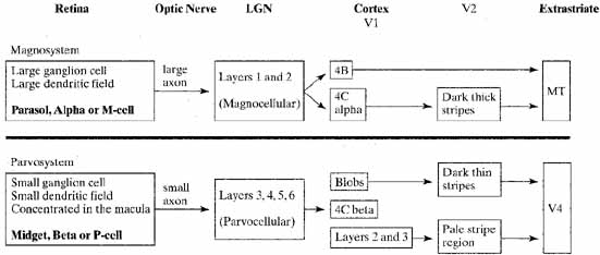 Layers 1 (receiving contralateral retinal projections) and 2 (receiving ipsilateral retinal projections) contain larger neurons and are, therefore, termed the magnocellular LGN layers. Conversely, layers 3 through 6 are termed paroocellular LGN layers. There is considerable evidence that at least two types of retinal ganglion cells project in a segregated fashion to either magnocellular (M cells) or parvocellular (P cells) LGN. Thereafter, this segregation remains true insofar as the magnocellular LGN projects to cortex area 4C alpha that eventually projects to middle temporal cortical area MT.28,77,78 Conversely, the parvocellular LGN projects to cortical area 4C beta and from there to layers 2 and 3 of area 17, to the pale stripe region of area 18, and finally, to areas V3 and V4. Thus, at the LGN the major division between lines of information remains established.