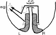 Fig. 13 Higher integration of vision. Diagram of primary visual cortices (stippled) and their projection to area of angular gyrus (ag) of left parietal lobe for analysis of visual stimuli. Note that right calcarine cortex is connected to left parietal area via pathway through splenium of corpus callosum (cc). Lesion 1 produces alexia and agraphia; lesion 2 produces only right homonymous hemianopia; combination of 2 and 3 produces right hemianopia and alexia despite intact left hemifields (i.e., the right visual cortex is disconnected from visual analytic areas in the left parietal lobe); lesion 4 produces only left homonymous hemianopia.
