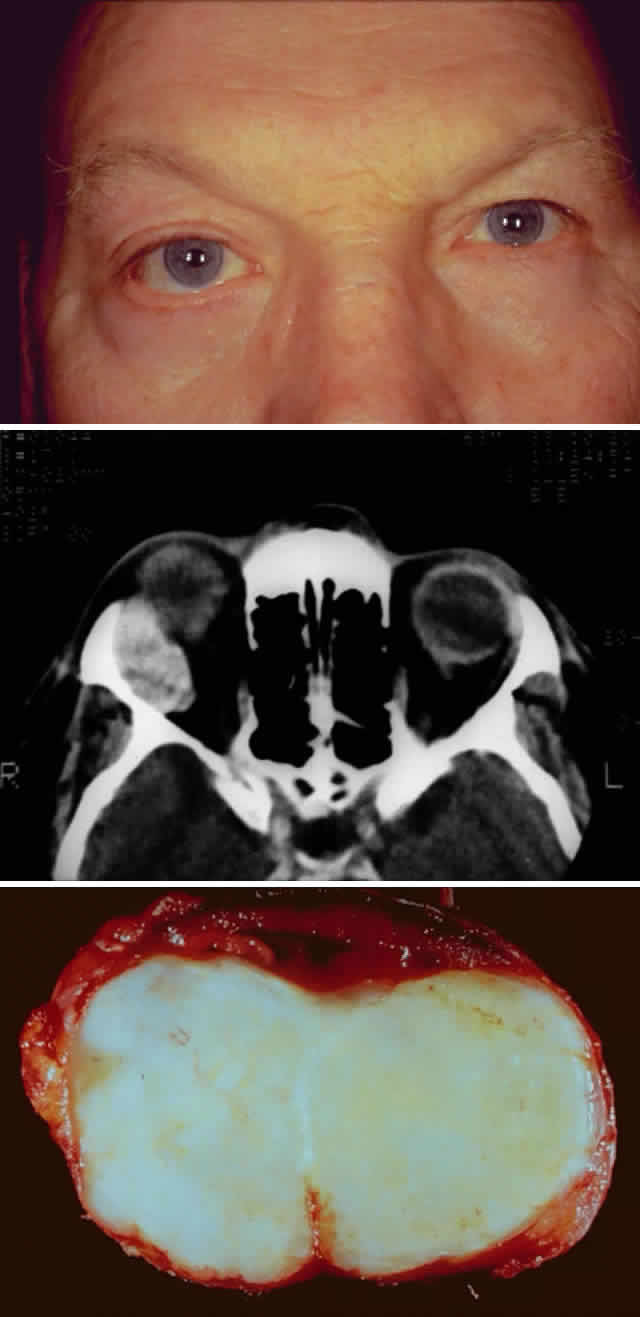 Pain in the lacrimal gland fossa may be associated with inflammation or malignant epithelial neoplasms of the lacrimal gland. Pain usually accompanies inflammatory processes, and the lacrimal gland fossa is no exception. The pain of lacrimal gland inflammation usually occurs early in the course of the disease and is associated with other inflammatory signs, including conjunctival injection and chemosis. Sometimes the pain is accentuated by movement of the globe or eyelids because of inflammation of adjacent tissues. Pain associated with malignant epithelial neoplasms of the lacrimal gland is secondary to bone and/or perineural invasion. Pain of these malignant epithelial neoplasms occurs late in the disease process and is usually associated with proptosis or a palpable mass. Enlargement of the lacrimal gland beyond its fossa will cause displacement of the globe. In these situations, there is proptosis with the globe displaced inferiorly and medially. In addition, there may be indentation of the globe that is visible during indirect ophthalmoscopy. The patient's age and duration of symptoms may help distinguish between the various disorders of the lacrimal gland fossa. Primary lacrimal gland tumors are rare in the pediatric population. Masses within the lacrimal gland fossa at this age are often congenital dermoid cysts, although benign and malignant lacrimal gland tumors in pediatric patients have been reported.9,13–18 Epithelial tumors of the lacrimal gland often present in the fifth or sixth decade of life, whereas malignant lymphoproliferative disorders of the lacrimal gland are common in patients aged 60 to 80 years. If the signs or symptoms have been present for more than a year, this suggests a slow-growing, benign epithelial neoplasm (less often a lymphoproliferative disorder). If signs and symptoms have been present for less than a year, then a malignant epithelial neoplasm or lymphoproliferative disease is more likely. Pain is common in the malignant epithelial neoplasms but rare in other tumors. Acute symptoms are suggestive of inflammatory disease, especially if associated with pain and erythematous swelling. |