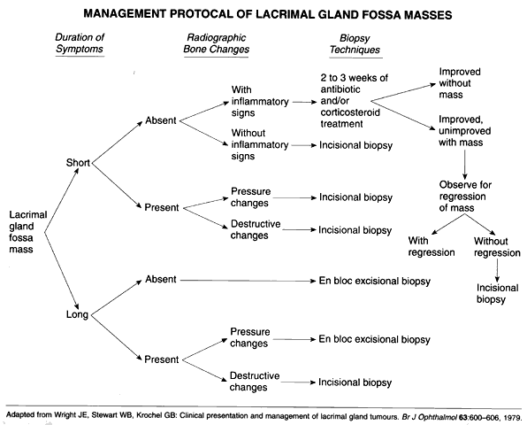 the patient's survival. Although treatment strategies need to be customized to the individual patient, some generalization can be made by separating patients with lacrimal gland disorders into four broad categories based on duration of symptoms as well as clinical and radiographic findings. These categories include: