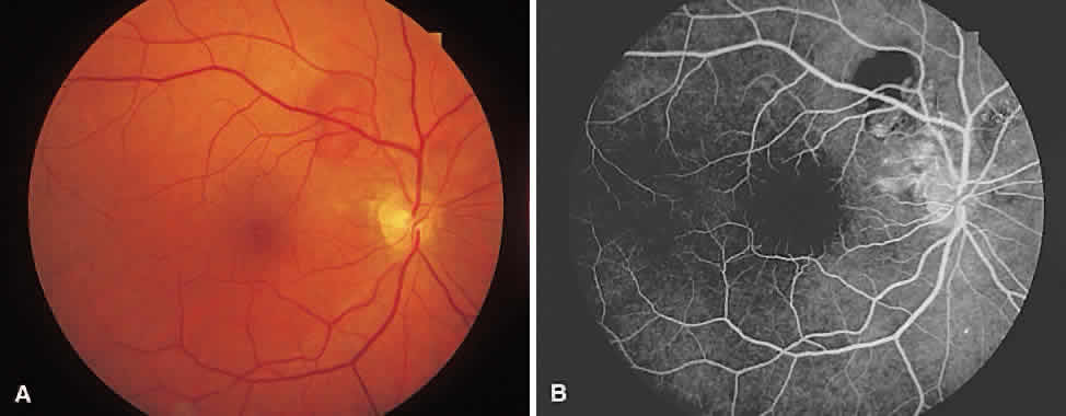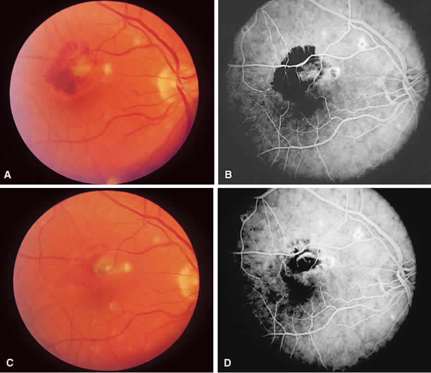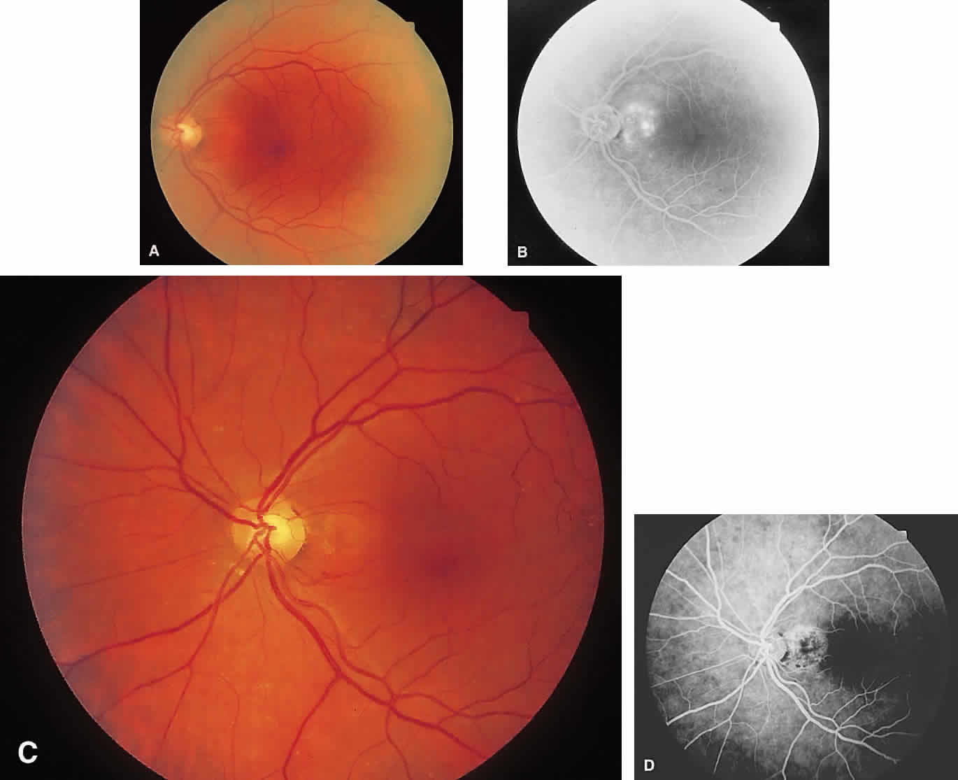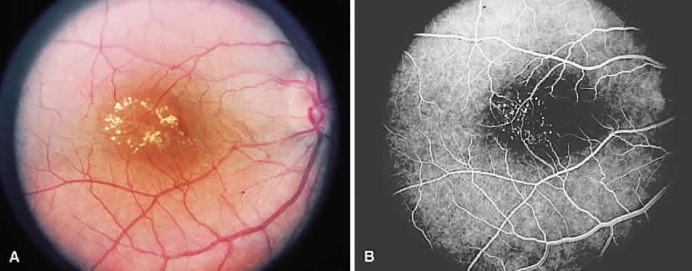with hypertension. Clinically, there are two characteristic findings. A sub-RPE vascular branching network is usually located in the area of the papillomacular bundle but can be isolated below the fovea. Reddish-orange nodules, called choroidal excrescences, are found at the edge of the vascular networks. Recurrent exudation and hemorrhage can occur under the RPE or retina (Fig. 34). Breakthrough bleeding into the vitreous is possible. Over time, the orange masslike lesions flatten with resolution of the leakage. New tubular vessels emanate from the flattened orange lesion. Fluorescein angiography shows filling of IPCV lesions with the choroidal vasculature. There is blocked fluorescence due to hemorrhage, exudate, or the RPE. IPCV vessels can leak, although not as much as in a choroidal neovascular membrane seen in AMD. The polypoid structures are hyperfluorescent and stain or leak on late frames. Indocyanine green angiography shows that IPCV vessels fill slower than choroidal vessels. The network of abnormal vessels is also larger than suspected clinically. The polypoid structures leak dye slowly.308 Vision is typically better in IPCV than in AMD, and vision can be improved with treatment of the lesions. In some cases, scarring can occur with attendant visual loss. Treatment is carried out to areas of leakage from the choroidal excrescences. Unlike in AMD, the entire complex need not be treated in IPCV. IPCV can be differentiated from AMD in the following ways. AMD patients are usually white. They usually have typical drusen and RPE changes that are often bilateral. The vessels seen in CNV due to AMD are not clinically visible. There is frequent scarring in AMD.308–311 |