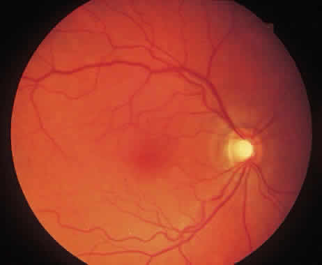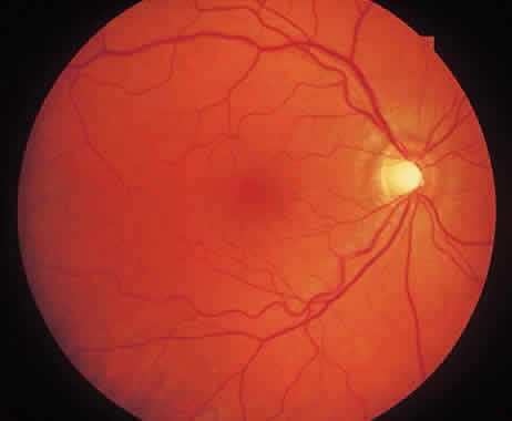 and includes most of the area between the vascular arcades.1,2 The anatomic fovea (fovea centralis) is 1.5 mm in diameter and centered 4 mm temporal and 0.5 mm inferior to the center of the disc (Fig. 1).1,3 The inner retinal surface of the fovea is concave. Clinically, the rim of the concave slope, called the clivus, causes a change in the retinal light reflex and appears as a slightly oval ring. There are no blood vessels in the central fovea. This capillary-free zone (foveal avascular zone) in the fovea is 400 to 500 μm in diameter.1,3 The center of the fovea is the foveola or foveal pit. The anatomic foveola is sometimes incorrectly referred to clinically as the fovea, much as the anatomic fovea is incorrectly referred to as the macula. It is roughly 350 μm in diameter and is contained within the foveal avascular zone. At its center it is free of cells except the outer segments of red and green cones. In the portion of the fovea surrounding the foveola, the nerve fiber, ganglion cell, and plexiform layers are present. At the center of the foveola is a small depression called the umbo. The foveola produces a reflected spot of light in the vitreous called the foveal light reflex. The parafoveal retina is about 500 μm wide and surrounds the fovea. It is characterized by the cellularity of the inner nuclear and ganglion cell layers. The nerve fiber layer is thicker, especially in the papillomacular bundle. The cone to ganglion cell ratio is 1:1. The perifoveal retina, 1500 μm wide, is the peripheral zone of the macular region. It extends to where the ganglion cell layer is reduced to the single layer of nuclei seen elsewhere in the peripheral retina. |
