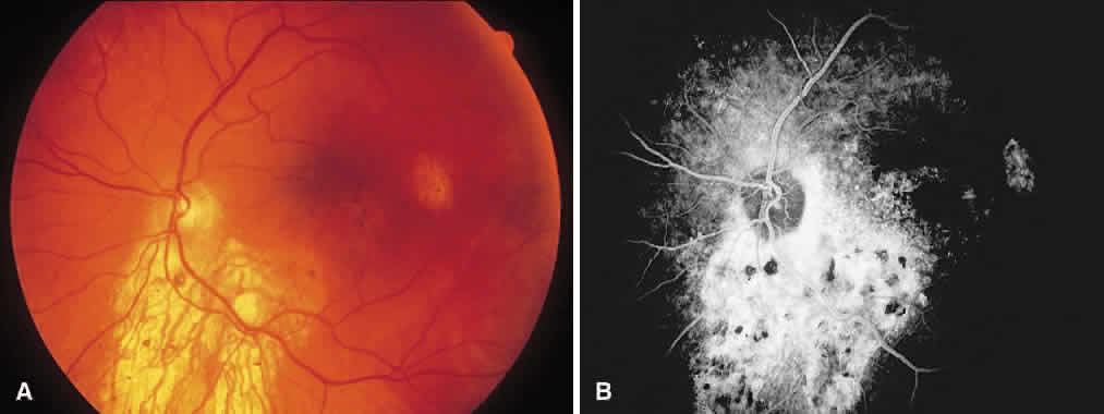 The precise location of SRNV is not always clear. Often the SRNV is obscured by hemorrhage, turbid serous fluid, pigment epithelial detachment, or extensive pigment clumping. Such membranes are referred to as occult SRNV and may be seen when relatively intact RPE overlies thin and subtle SRNV (Fig. 9). Occasionally, clinical signs of SRNV (hemorrhage, exudate, serous detachment) are present, but the SRNV cannot be found by angiography. The visual prognosis is poorer for these eyes than for those with distinct, clearly defined SRNV membranes. In some cases, SRNV hyperfluoresces late in the angiogram but not early. There may be a gradual oozing of fluorescein through multiple pinpoint areas of RPE overlying the SRNV membrane. The slow hyperfluorescence may be related to a decreased flow of blood through the membrane or to a relatively intact RPE. An RPE tear may occur at the junction of attached and detached RPE, where contraction of the SRNV may tear the RPE. The torn edge of RPE retracts and is pulled by the fibrovascular tissue (Fig. 10). In the acute period, a serous detachment of the sensory retina may occur because of the fluid leaking from the exposed choriocapillaris. The subretinal fluid usually resorbs in a few days.43,62,63 Indocyanine green angiography is sometimes helpful in cases of occult CNV. Because indocyanine dye is protein-bound, it does not leak from the choriocapillaris as does fluorescein. On stimulation with an infrared source, the dye fluoresces weakly. Well-defined areas of fluorescence are termed hot spots and are assumed to represent CNV. Feeder vessels can occasionally be seen extending from a natural or laser scar to an area of recurrent CNV (Fig. 11).64 Although they can be seen on fluorescein angiography, high-speed indocyanine green video angiography is often used to increase detection in cases of new subfoveal CNV.65 Feeder vessels can be thought of as having either an umbrella pattern or a racquet pattern.66 In an umbrella pattern, the feeder vessel is oriented in an anteroposterior fashion between the CNV complex and choroidal space. With a racquet pattern, the feeder vessel passes more obliquely from the choroidal space toward the CNV complex. HISTOLOGY The SRNV arises from the choroid and passes through Bruch's membrane to invade the subpigment epithelial and subsensory retinal space. The vessels may pass through pre-existing breaks in Bruch's membrane or may produce breaks in the membrane.67 However, breaks in Bruch's membrane can occur without any growth of vessels from the choriocapillaris. The SRNV proliferates under the RPE and destroys it. The vessels may also cause hemorrhagic or serous detachment of the RPE, the sensory retina, or both. Cystic changes may develop in the overlying sensory retina. New vessel growth is accompanied by fibrous tissue, which ultimately becomes the dominant pathologic change and results in a disciform scar involving the choroid, RPE, and sensory retina.59 Active neovascularization may intermittently bleed at the edges of the developing scar. Further, the overlying retinal vessels and the choroidal vessels supplying the scar may anastomose. Also, although found most frequently in the macular region, extramacular disciform lesions may occur and simulate choroidal melanomas. PATHOGENESIS The association between new vessel growth and drusen formation has been well described; both processes are related to degeneration of the RPE. Soft drusen represent the breakdown of the hyaline content in hard drusen or the focal accumulation of membrane debris that lies between the RPE basement membrane and the inner collagenous layer of Bruch's membrane. These detachments predispose to pigment epithelial detachment formation and to SRNV. Why SRNV develops is unknown, but evidence suggests that choroidal vessels, in the absence of an effective barrier and inhibitory factors released by normal RPE, may be exposed to mitogenic and chemotoxic retinal factors that stimulate SRNV.57,68,69 TREATMENT The MPS produced its first result in 1982 and continued with more than two dozen reports. As a prospective study, it helped define acceptable treatment for CNV associated with AMD, ocular histoplasmosis, and idiopathic CNV. The influence of different laser wavelengths used in treatment was also studied.70 Laser treatment can be classified into subfoveal, juxtafoveal (1 to 199 μm from the center of the foveal avascular zone), and extrafoveal types. EXTRAFOVEAL TREATMENT. The first MPS71 report found that 60% of untreated eyes and only 25% of treated eyes had severe visual loss (six or more lines of vision) in the AMD group. These results led to the termination of this arm of the study. The 3-year results72 found that 62% of untreated eyes and 47% of treated eyes had suffered severe visual loss. The 5-year results were similar to the 3-year results.73 The higher incidence of severe visual loss in the treated group at the 3-year follow-up versus baseline was due to recurrent CNV, which was seen in 54% of eyes. Almost three quarters of recurrences occurred in the first year after treatment. Cigarette smoking was associated with a higher risk of recurrence (85% vs. 51%). JUXTAFOVEAL TREATMENT. The 5-year data for AMD showed that treated eyes were less likely to have severe visual loss compared with untreated eyes (55% versus 65%) (Fig. 12). Recurrences occurred in 47% after 5 years in the treated group.73 Peripapillary CNV was studied as well (Fig. 13): it was found that 14% of treated and 26% of untreated eyes had severe visual loss.74 SUBFOVEAL TREATMENT. Three months after subfoveal treatment, 20% of treated eyes suffered severe visual loss compared with 11% of untreated eyes. After 2 years, 20% of treated eyes still had suffered severe visual loss, but now 37% of untreated eyes had suffered severe visual loss. After 4 years, 23% of treated and 45% of untreated eyes had suffered severe visual loss. The size of the subfoveal CNV is important in pred