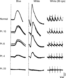 stages of retinitis pigmentosa. The previous classification of these diseases was based on the family of origin (e.g., Nougaret type), by the original description of the ERG waveforms associated with the condition (e.g., Riggs type or Schubert-Bornschein), or by the ophthalmologist who first described the disease (e.g., Oguchi disease). These diseases are now being reclassified by molecular genetic analysis.247 Missense mutations in three different genes encoding members of the rod phototransduction cascade have been reported to cause dominantly inherited stationary night blindness. Specifically, the mutations are the Ala292Glu and Gly90Asp mutations in rhodopsin,248,249 the His258Asp mutation in the β-subunit of rod phosphodiesterase,250 and the Gly38Asp mutation in the α-subunit of rod transducin.251 The latter mutation has only been seen in the descendants of Jean Nougaret. Although the Ala292Gly rhodopsin mutation apparently causes a complete loss of rod function (i.e., Riggs type),248 the other mutations cause an incomplete loss of rod function.251,252 Some evidence exists from psychophysical and ERG testing that the rods are constitutively active in the dark in some forms of stationary night blindness. This has been suggested for patients with the rhodopsin, Gly90Asp mutation.249 The ERG abnormalities in patients with the Gly38Asp mutation in the α-subunit of rod transducin can be simulated by light adapting the normal retina, compatible with the idea that these patients have mutant rod transducin that is constitutively active in the dark.252 Further evidence that these patients have rod photoreceptors despite their night blindness is provided by fundus reflectometry studies that have shown normal levels of rhodopsin and normal rhodopsin kinetics.253 Oguchi disease is a recessively inherited form of stationary night blindness. Following 1 hour of dark adaptation, patients with Oguchi disease have no rod b-wave in response to dim blue light flashes, a cornea-negative response to white light, and a normal cone response to 30-Hz white flicker. Following complete dark adaptation after 12 hours, some patients have a normal rod b-wave amplitude and normal rod b-wave implicit time but only in response to one or two flashes of light.254 Apparently the test flash used to elicit the ERG, although relatively dim, can be intense enough to light adapt the rod system. Molecular genetic analyses have shown a null mutation, Asn309(1-bp del), in the gene encoding arrestin in some patients of Japanese descent.255 Several null mutations have also been described in the gene encoding rhodopsin kinase in some patients of Eastern European descent.256 Both arrestin and rhodopsin kinase participate in the deactivation of photoactivated rhodopsin. The lack of either arrestin or rhodopsin kinase would be expected to have the same physiologic effect, namely the prolongation of photoactivated rhodopsin with a consequent abnormality in rod sensitivity. Fundus albipunctatus is another form of recessively inherited stationary night blindness.257,258 Patients with fundus albipunctatus have a delay in rod visual pigment and foveal cone pigment regeneration, as monitored with fundus reflectometry.257 Changes in visual pigment levels parallel the prolonged cone and rod limbs of the dark-adaptation curve. Full-field ERGs have been found to be normal with respect to both cone and rod amplitudes and b-wave implicit times after full dark adaptation.258 The findings in fundus albipunctatus suggest an abnormality in visual pigment regeneration secondary to some abnormality in the relationship between the photoreceptors and the pigment epithelium. The composition of the yellow-white lesions and their relationship to the abnormality in visual pigment regeneration are not known. Patients with this condition have been observed to have defects in the gene encoding 11-cis retinol dehydrogenase.259 A form of stationary night blindness for which the precise gene defect remains unknown is congenital nyctalopia with myopia. This condition (i.e., Schubert-Bornschein type) is inherited by either an X-linked or autosomal recessive mode.260–262 The extent of the myopia is characteristically -3.5 to -14.5 diopters (D). Patients cannot attain normal dark-adapted rod thresholds and have fundus findings of myopia. Their rod ERG b-wave responses to dim blue light are nondetectable, and the patients have a characteristic cornea-negative response to white light in the dark-adapted state and normal or nearly normal cone responses to 30-Hz white flicker. The preservation of the a-wave from the rod photoreceptors with loss of the b-wave from neurons proximal to the photoreceptors suggests some abnormality in intraretinal transmission of the response from the rod photoreceptors to proximal retinal cells. ERG amplitudes are reduced in congenital nyctalopia with myopia compared with those from normal emmetropes; this probably occurs because of the known reductions of ERG amplitude seen in patients with moderate axial myopia as the only finding.263 The ERG abnormality in congenital nyctalopia with myopia has been reported as an acquired defect in patients with cutaneous malignant melanoma, who have an acute onset of night blindness with selective reduction in the rod b-wave response264 (Fig. 18). Development of an antibody to the melanoma that also reacts to retinal cells with an interruption in rod signal transmission has been considered as a probable mechanism to account for the sudden onset of night blindness in patients with this paraneoplastic retinopathy. Patients with congenital nyctalopia have been further subdivided into two groups designated as the complete or incomplete form of the condition based on dark-adaptation measures and ERG amplitudes. In the complete form, the rod a-wave is normal, whereas the rod b-wave is absent and responses are mediated by the cone system. In the incomplete form, rod ERG responses, although reduced in am