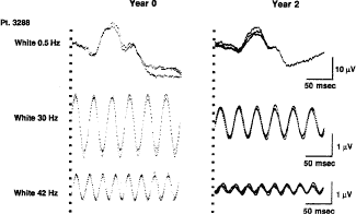 ELECTRORETINOGRAMS In 1945 Karpe35 reported that patients with advanced retinitis pigmentosa have very small or nondetectable (less than 10 μV) electroretinograms (ERGs). Subsequently it has been shown that patients with early retinitis pigmentosa can have reduced but easily detectable ERG responses.36–39 Responses are not only reduced in size but are also delayed with respect to the time interval between stimulus flash onset and corresponding response peaks (i.e., b-wave implicit time).38–42 These ERG changes can be detected in some instances many years before diagnostic abnormalities are visible on fundus examination.41 Figure 2 illustrates representative full-field ERGs from a normal subject and four children with early retinitis pigmentosa. Rod responses to single 0.5-Hz flashes of blue light (left column) are reduced and, when detectable, are delayed in b-wave implicit times. Cone responses to 30-Hz white flickering light (right column) are normal or reduced in amplitude and normal or delayed in b-wave implicit times. In most cases, cone b-wave implicit times are so delayed that a phase shift occurs between the stimulus flash onset (designated by the vertical lines) and the corresponding response peaks; each stimulus flash elicits the next-plus-one response in contrast to the normal. In mixed cone-rod responses to single 0.5-Hz flashes of white light (middle column), the cornea-negative a-wave generated by the photoreceptors is reduced in amplitude in all genetic types; this reflects the early involvement of the photoreceptors in this group of diseases.41 The reduced and delayed ERGs recorded from patients with widespread progressive forms of retinitis pigmentosa contrast with the reduced ERGs with normal b-wave implicit times observed in patients with self-limited sector retinitis pigmentosa. Figure 3 shows full-field ERGs from a father and son with dominantly inherited sector retinitis pigmentosa separated in age by almost 30 years; they have comparably reduced ERGs with normal b-wave implicit times. Patients with sector retinitis pigmentosa usually have patches of intraretinal pigment that are confined to one or two quadrants of the periphery of each fundus, with loss of peripheral rods and cones and consequent reductions in both rod and cone full-field ERG amplitudes. ERGs recorded from patients with sector retinitis pigmentosa are comparable to those recorded from patients who have large chorioretinal scars in the periphery.41 Full-field ERG testing can be used not only to identify which patients have widespread progressive forms of retinitis pigmentosa but also to determine which relatives are normal. Relatives of patients with retinitis pigmentosa, age 6 or older, with normal rod and cone ERG amplitudes and implicit times have not been observed to develop widespread progressive forms of retinitis pigmentosa at a later time.41–43 CARRIERS OF X-LINKED RETINITIS PIGMENTOSA Females with the carrier state of X-linked retinitis pigmentosa can present with an area of bone spicule pigmentation in the periphery or an abnormal tapetal reflex in the macula. Less than 50% of carriers of child-bearing age show diagnostic findings on ophthalmoscopic examination, whereas more than 90% have abnormal ERGs.44 Abnormal ERGs in obligate carriers are either reduced in amplitude or delayed in cone b-wave implicit time, or both, in one or both eyes44,45 (Fig. 4). Daughters of obligate carriers can have either normal ERGs or abnormal ERGs similar to those recorded from obligate carriers.44 Female carriers of X-linked retinitis pigmentosa can have a slowly progressive retinal degeneration, although the natural course remains to be defined. Some female carriers have had considerable loss of visual field and substantial reductions in ERG amplitudes by age 70.44 The abnormal ERGs of female carriers of X-linked retinitis pigmentosa contrast with the normal full-field ERG amplitudes and normal fundi observed in obligate female carriers of autosomal recessive disease.44 Carriers of X-linked retinitis pigmentosa have a 50% chance of having an affected son and a 50% chance of having a carrier daughter with each childbirth. NATURAL COURSE The ERG provides a quantitative measure of remaining retinal function in patients with retinitis pigmentosa. Figure 5 illustrates ERGs from affected patients followed over a 10-year period; responses become smaller as the condition progresses. Responses less than 10 μV are nondetectable with conventional recording techniques (i.e., without signal averaging). Patients with nondetectable conventional ERGs can still retain considerable visual function because most are not legally blind until ERG amplitudes decline to 0.05 μV or less. Signal averaging with a bipolar artifact reject buffer and narrow-bandpass