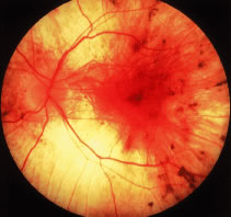 areas of atrophy can be seen205 and patients usually become virtually blind between the ages of 40 to 55 because