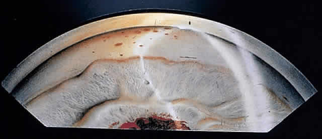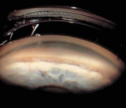 Fig. 3. Central posterior synechiae leading to pupillary block and iris bombe. (Courtesy Paul F. Palmberg, MD, PhD, Bascom Palmer Eye Institute, University of Miami. Alward WLM: Color Atlas of Gonioscopy. London: Mosby-Year Book, 1994.)