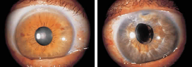 Fig. 5. Left and right eye of patient with Fuchs' heterochromic iridocyclitis. Affected left eye appears gray due to iris stromal atrophy. The iris surface is featureless. Left eye is also aphakic.